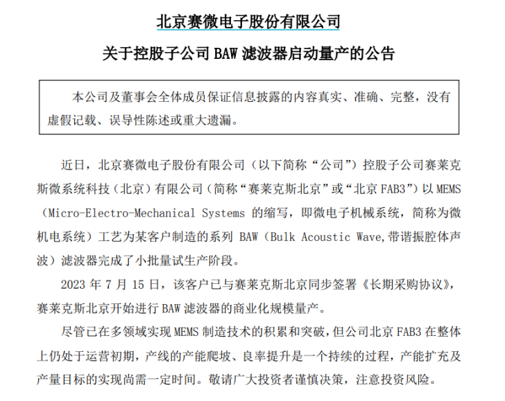在7月中旬,赛微电子曾宣布,其子公司赛莱克斯微系统科技(北京)有限公司(北京FAB3)以 MEMS (微电子机械系统)工艺为某客户制造的系列 BAW滤波器完成了小批量试生产阶段。