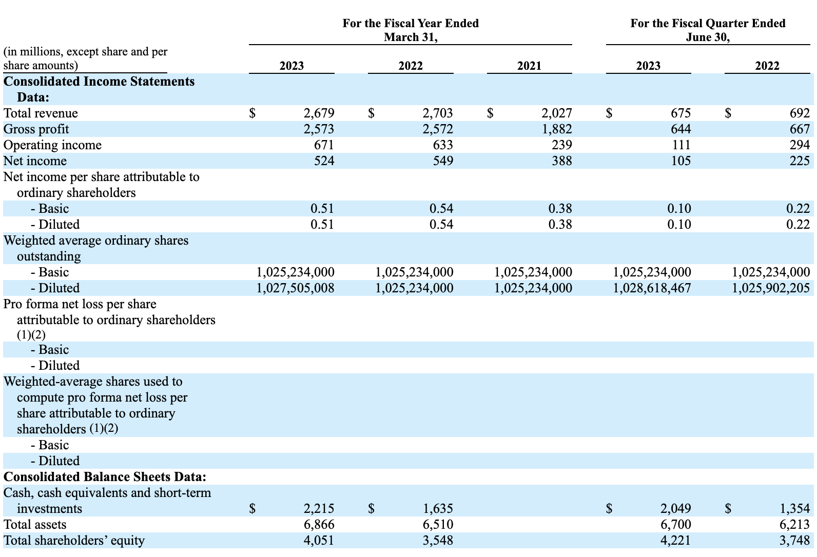此外,根据招股书数据,2021财年至2023财年,Arm年收入分别为20.27亿美元、27.03亿美元、26.79亿美元;净利润分别为3.88亿美元、5.49亿美元、5.24亿美元。自成立以来,Arm芯片出货量累计超过2500亿颗,拥有超过1500万名软件开发者。