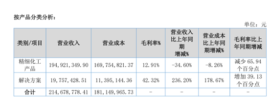 从具体的产品收入构成上看,今年上半年美邦科技的精细化工产品实现收入约1.9亿元,同比下降34.6%;解决方案实现营业收入约0.2亿元,同比增长236.2%。