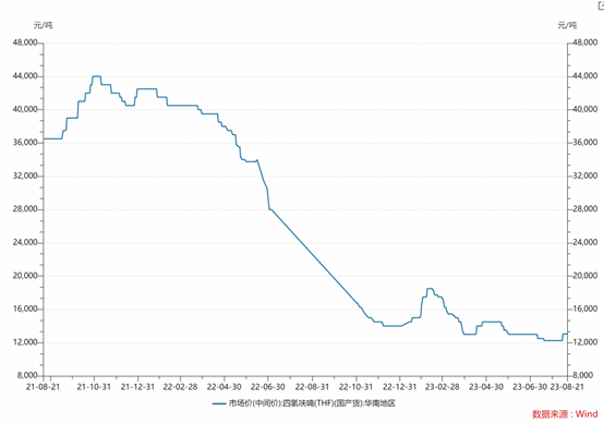 Wind数据显示,四氢呋喃的价格出现了较大程度的下滑。华南地区的四氢呋喃中间价从2021年11月的高点约4.4万元/吨一路下降至了目前约1.3万元/吨,价格回撤幅度非常大。