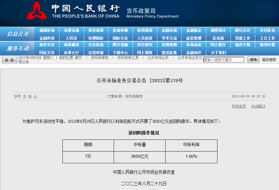 而央行层面已经有所动作。人民银行8月29日公告称,为维护月末流动性平稳,人民银行以利率招标方式开展了3850亿元逆回购操作,中标利率为1.8%。由于当日有1110亿元逆回购到期,公开市场实现净投放2740亿元。