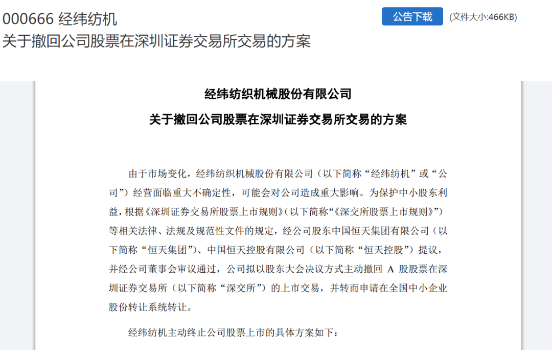 8月29日晚上10点30左右,经纬纺机在深交所公告称,由于市场变化,公司经营面临重大不确定性,可能会对公司造成重大影响。为保护中小股东利益,根据《深圳证券交易所股票上市规则》等相关法律、法规及规范性文件的规定,经公司股东恒天集团、恒天控股提议,并经公司董事会审议通过,公司拟以股东大会决议方式,主动撤回A股股票在深交所的上市交易,并转而申请在全国中小企业股份转让系统转让。