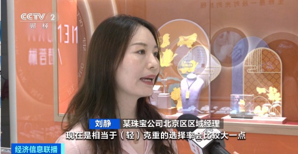 某珠宝公司北京区区域经理刘静:购买黄金饰品的人较去年同期增加至少三倍,现在轻克重的选择率较大,消费者选择的款式和风格也偏多。