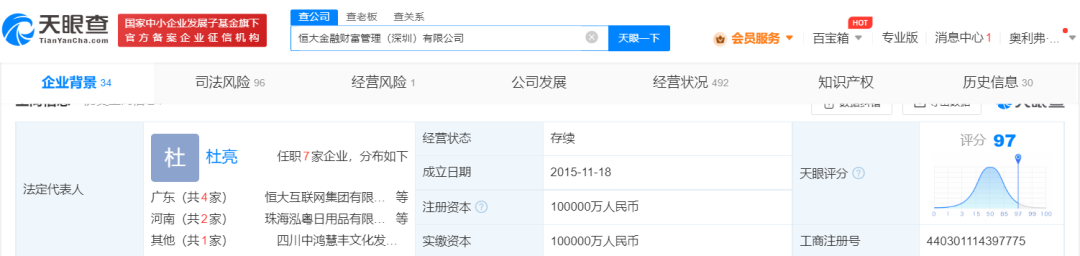 恒大金融成立于2015年11月,法定代表人杜亮,注册资本10亿元,由恒大金融控股集团(深圳)有限公司全资持股,后者为恒大集团有限公司全资子公司。