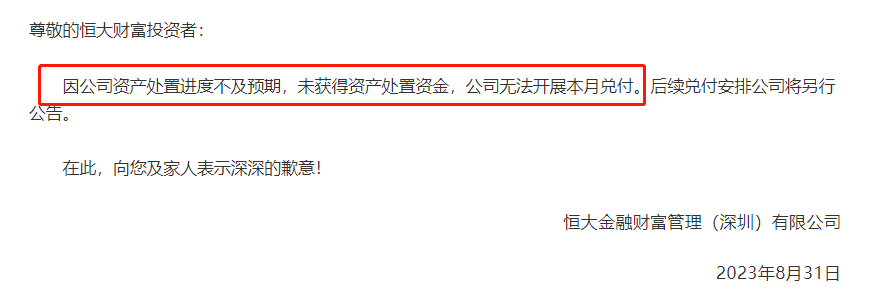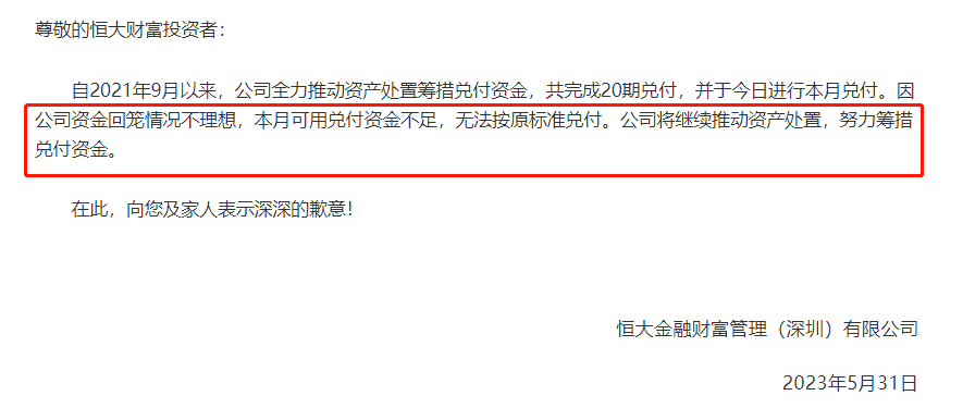 恒大财富在2023年5月31日公告称,因公司资金回笼情况不理想,本月可用兑付资金不足,无法按原标准兑付。