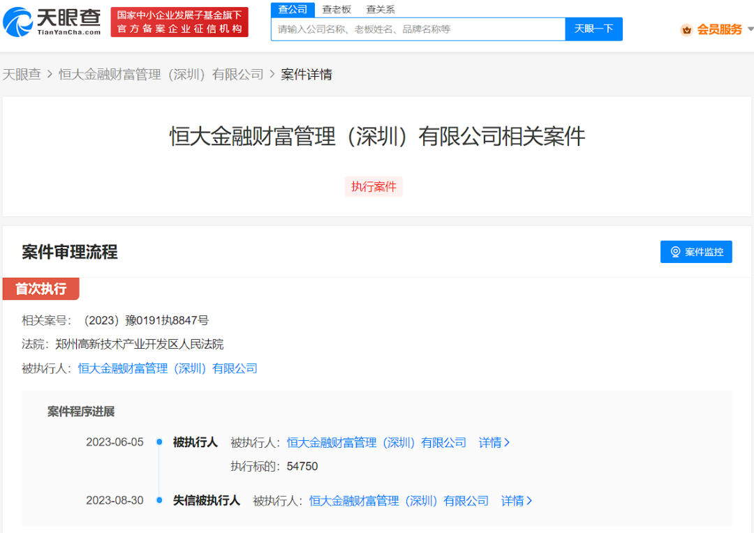 案件流程信息显示,2023年6月,恒大金融因上述案件,被强制执行5.4万余元。