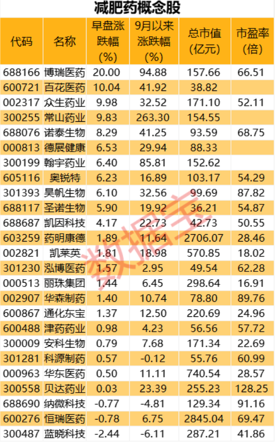 据证券时报,9月以来,减肥药概念热度持续走高,概念股平均涨幅达到31.48%,成为近期收益最好的板块之一。常山药业、博瑞医药、翰宇药业涨幅居前,分别上涨263.3%、94.88%、85.81%。