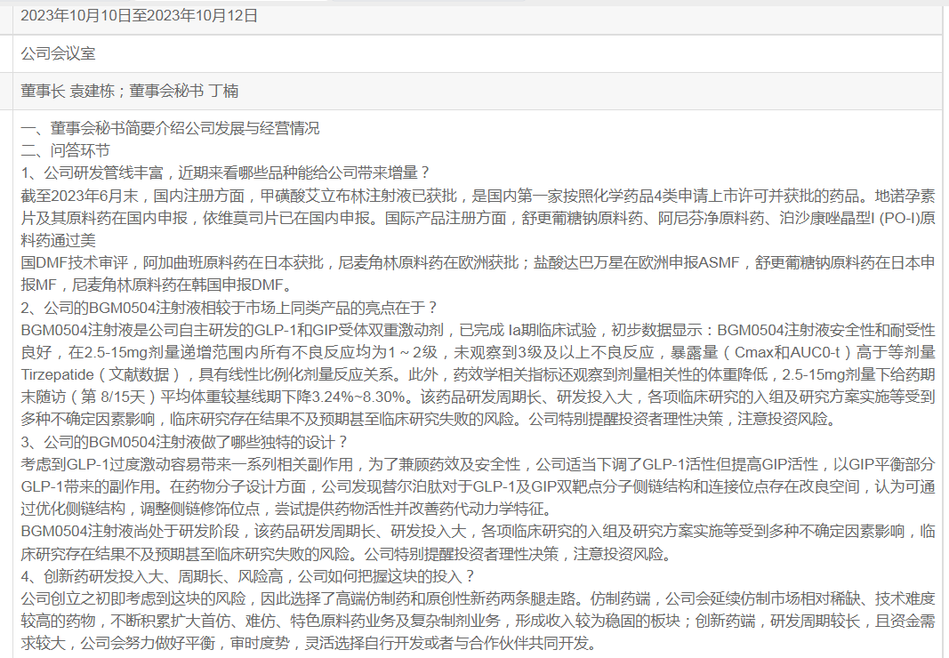 BGM0504注射液尚处于研发阶段,该药品研发周期长、研发投入大,各项临床研究的入组及研究方案实施等受到多种不确定因素影响,临床研究存在结果不及预期甚至临床研究失败的风险。公司特别提醒投资者理性决策,注意投资风险。