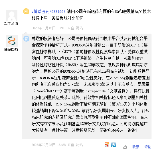 有投资者在互动易平台询问公司在减肥药方面的布局和进展情况,9月12日,博瑞医药对此也进行了相关回复: