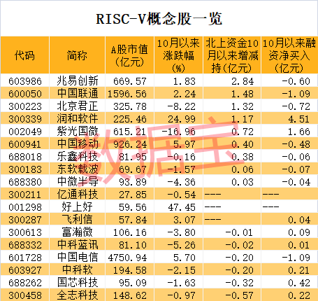 二级市场表现来看,截至10月18日收盘,RISC-V概念股10月以来平均上涨2.53%。好上好、润和软件、中国移动、中国电信、飞利信等涨幅排在前五位。收盘价与年内高点相比,国芯科技、富瀚微、紫光国微、北京君正、全志科技、中微半导、乐鑫科技等回撤幅度超30%。