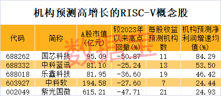 从业绩增长潜力来看,根据5家以上机构一致预测,今明两年净利润增速均有望超20%的概念股有5只,分别是国芯科技、中科蓝讯、乐鑫科技、中科软、紫光国微。