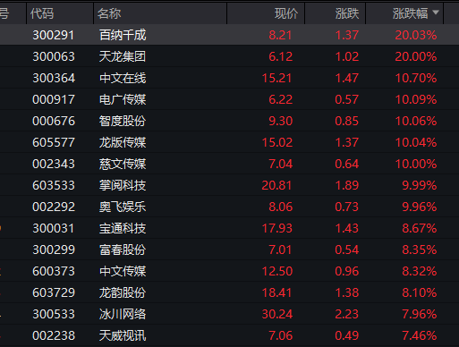 板块和赛道方面,传媒、游戏板块掀起涨停潮,百纳千成、天龙集团等触及“20cm”涨停,另有多股涨停或涨幅超过10%。