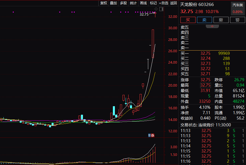 天龙股份今天上午盘中连续第7个交易日触及涨停。