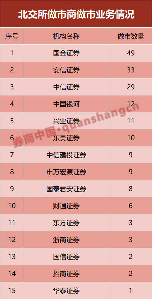 市场人士预计,做市商扩容落地后将为北交所市场进一步引入增量资金,北交所流动性有望持续改善,北交所吸引力有望不断攀升。截至目前,北交所一共有15家做市商,包括中信证券、中信建投、银河证券等。