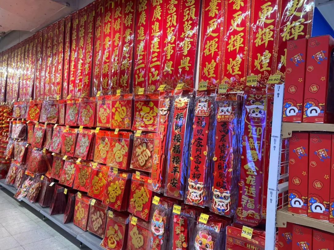 春节临近,记者在大型商超走访看到,对联、福字已经上架销售,喜气装点着整个超市。