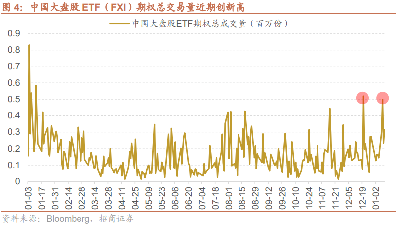 据招商证券跟踪,1月9日FXI期权的总成交量便已飙升至50万份合约,其中看涨期权交易量达40.5万份,占比超过八成。距离前次该期权达到同等活跃水平,中间间隔不到一月。