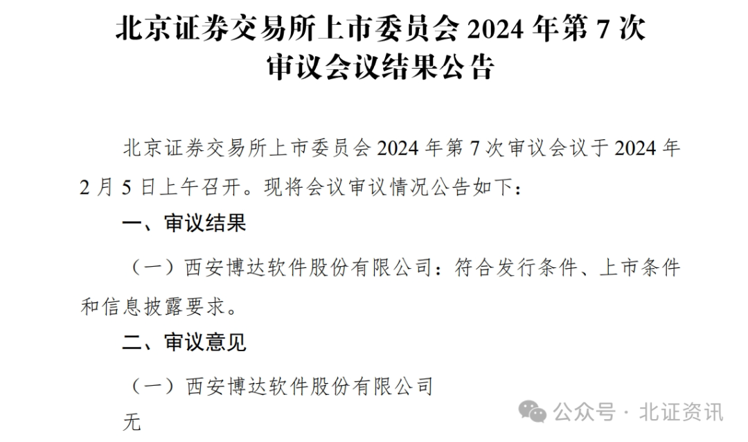 2月5日,北交所上市委举行2024年第7次审议会议,二次上会的博达软件“符合发行条件、上市条件和信息披露要求”,终于成功“过关”。博达软件于去年6月29日获北交所受理上市材料,经过两轮问询后,于2023年11月29日首次上会但被暂缓。