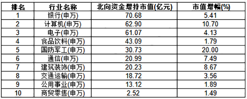 Choice数据显示,过去1个月,银行板块获北向资金增持70.68亿元,在申万31个一级行业中排名首位;计算机和电子分别获得北向资金增持62.9亿元和61.07亿元,排名第二和第三。另外,食品饮料、国防军工、通信等板块均获北向资金增持逾20亿元。