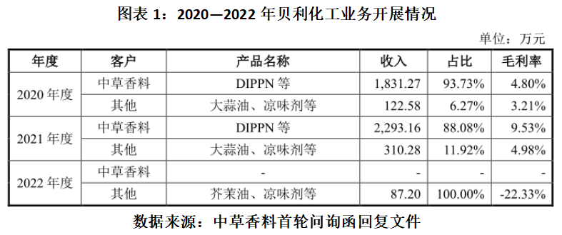 这意味着,2020年、2021年,贝利化工近九成营业收入来自中草香料。