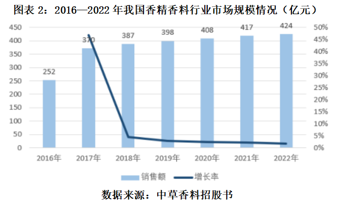 据中国香料香精化妆品工业协会数据显示,2016—2022年,我国香料香精行业市场规模整体呈增长趋势,但2017年后,行业销售额增速显著放缓,从2017年的46.83%下滑至2022年的1.68%。