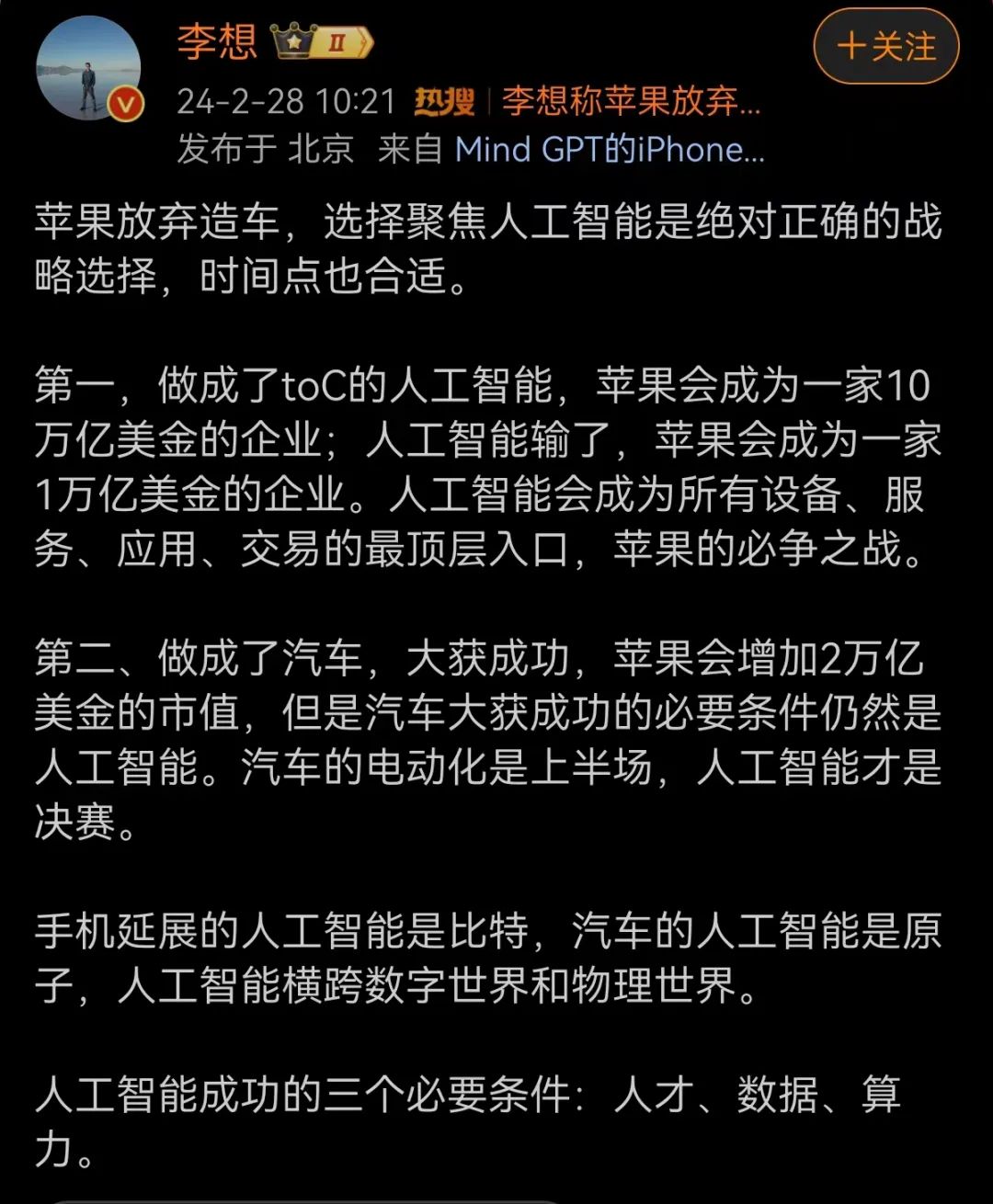 李想表示,做成了toC的人工智能,苹果会成为一家10万亿美金的企业;人工智能输了,苹果会成为一家1万亿美金的企业。人工智能会成为所有设备、服务、应用、交易的最顶层入口,苹果的必争之战。做成了汽车,大获成功,苹果会增加2万亿美金的市值,但是汽车大获成功的必要条件仍然是人工智能。汽车的电动化是上半场,人工智能才是决赛。