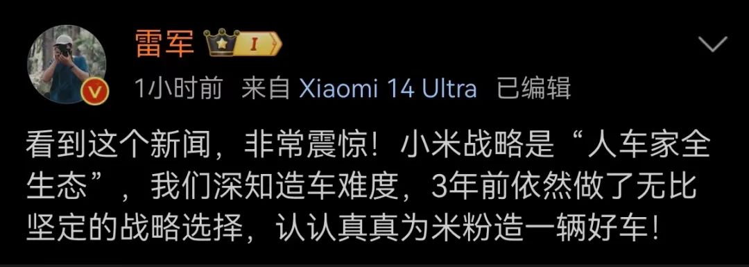 雷军也在微博发文称:看到这个新闻,非常震惊!小米战略是“人车家全生态”,我们深知造车难度,3年前依然做了无比坚定的战略选择,认认真真为米粉造一辆好车!