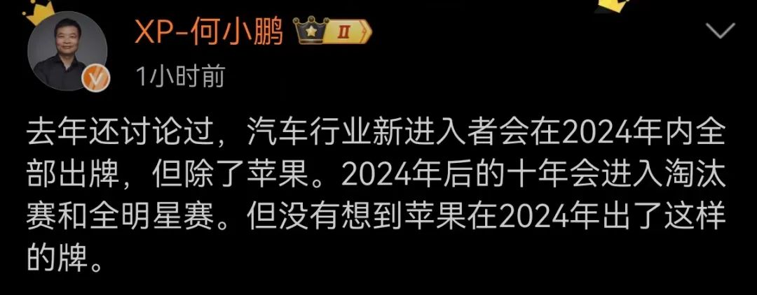 小鹏汽车董事长何小鹏表示,去年还讨论过,汽车行业新进入者会在2024年内全部出牌,但除了苹果。2024年后的十年会进入淘汰赛和全明星赛。但没有想到苹果在2024年出了这样的牌。