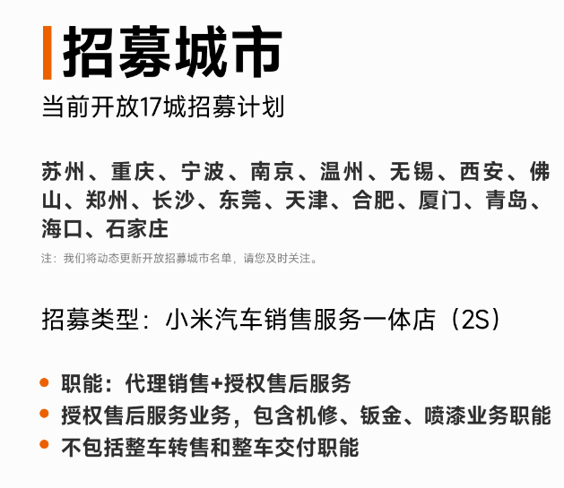 据悉,小米汽车开放城市招募计划的招募类型为小米汽车销售服务一体店(2S),其职能包含新车代理销售和授权售后服务,但不包括整车转售和整车交付职能。“小米汽车销售模式充分融合小米集团新零售体系经验,打造业内领先的汽车新零售模式。”小米汽车方面表示,小米汽车销交服渠道,以“1+N”模式优先覆盖头部市场,分批次布局全国。