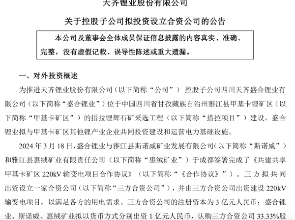 3月19日晚间,国内锂资源巨头天齐锂业公告称,为推进天齐锂业控股子公司四川天齐盛合锂业有限公司(以下简称“盛合锂业”)位于中国四川省甘孜藏族自治州雅江县甲基卡锂矿区(以下简称“甲基卡矿区”)的措拉锂辉石矿采选工程(以下简称“措拉项目”)建设,盛合锂业拟与甲基卡矿区其他锂产业企业共同投资建设和运营电力基础设施。