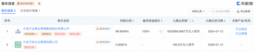 据天眼查APP显示,该公司股东分别为大连万达商业管理集团股份有限公司、大连万裕企业管理有限公司,持股比例分别为99.9938%、0.0062%。