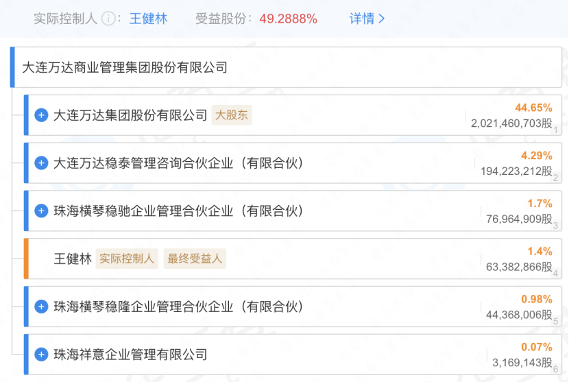 其中,大连万达商业管理集团股份有限公司的实际控制人为王健林,受益股份比例为49.2888%。