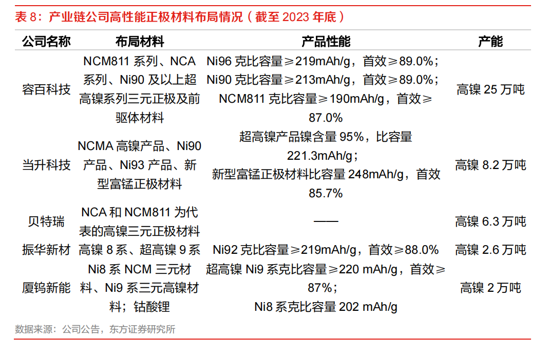 据东方证券研报,截至2023年底,容百科技(SH688005,股价31.9元,市值154.47亿元)、当升科技、贝特瑞高镍产能分别为25万吨、8.2万吨和6.3万吨。