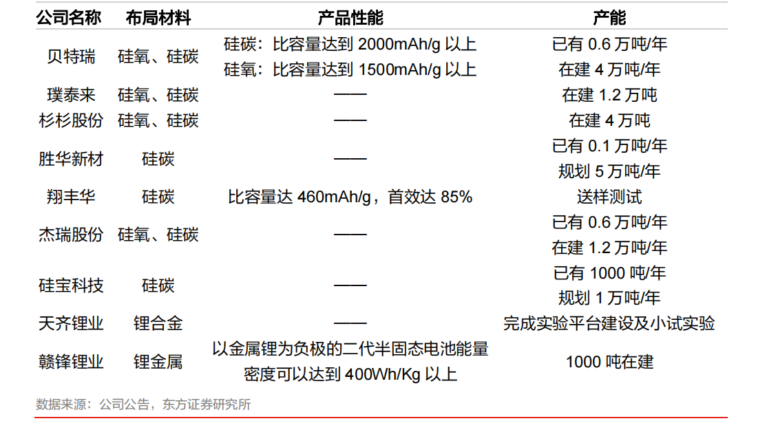 目前,半固态选择硅碳作为负极材料。而未来的全固态电池,或将使用锂金属作为负极材料。据东方证券研报,硅基材料是负极重要迭代方向,锂金属负极或为长期目标。