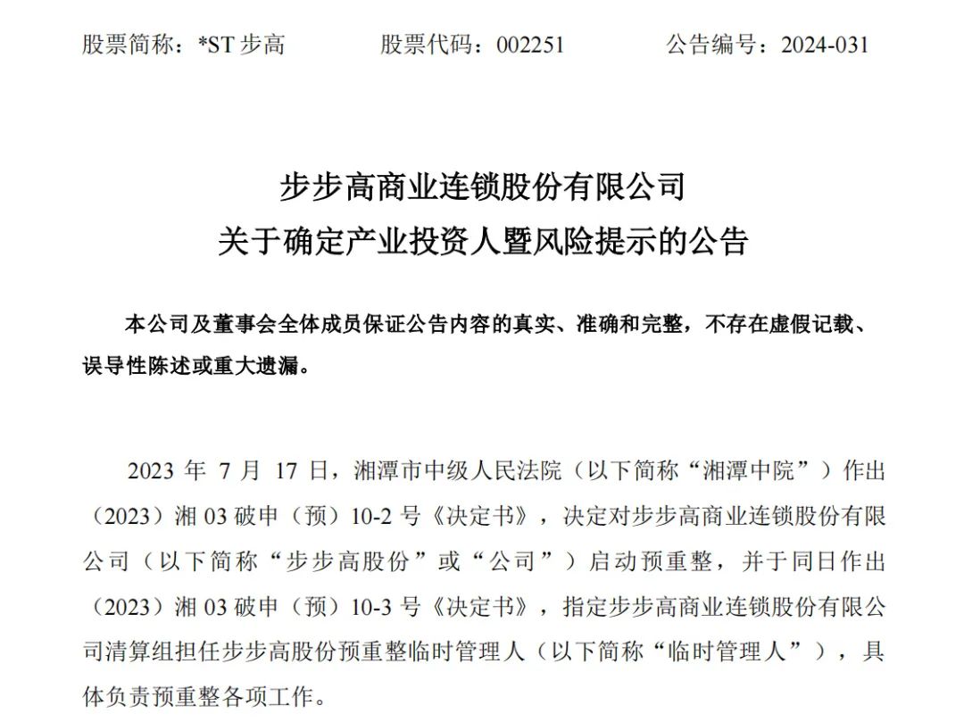 公告显示,*ST步高管理人将向前述企业发出《确认函》,确认其产业投资人身份,并将及时组织公司开展重整投资协议具体条款的磋商及签订工作。