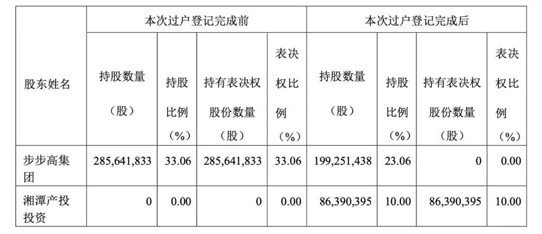 本次股份转让前,王填为*ST步高实际控制人。本次股份转让后,湘潭产投持有*ST步高10.00%股份。步步高集团放弃剩余所持*ST步高23.06%股份对应的表决权。由此,湘潭产投投资成为上市公司控股股东,湘潭市国资委成为公司实际控制人。