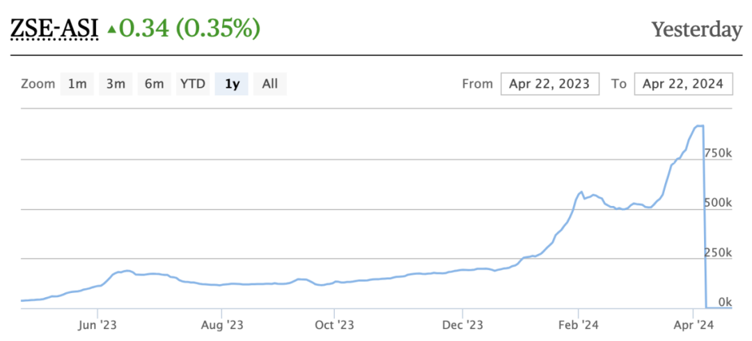 截至当地时间4月22日周一收盘,津巴布韦全股指数报96.33点。津巴布韦股市自年初直至新货币发行之前,全股指数涨幅超过330%,并于4月5日达到历史高点,随后仅在4月8日一个交易日,指数从915936.81点跳水至100.23点,单日跌幅超过99.99%,年初至今跌幅达到99.95%。