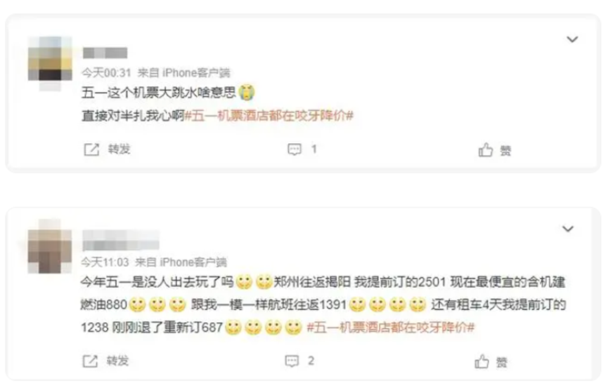 史上最忙“五一”小长假将至,多数家庭已安排境内外出游计划,出游需求正在全面释放。然而,近两日“五一机票价格下降”“五一1500元机票跳水至400元”“五一机票酒店都在咬牙降价”等话题冲上社交媒体热搜,引发消费者关注。