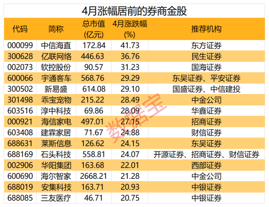 4月份上证指数成功站上3100点。板块方面,家用电器、银行、基础化工、医药生物、汽车板块涨幅居前。据数据宝统计,4月310只券商金股中,有185只股票上涨,占比近六成,其中15股涨超20%。