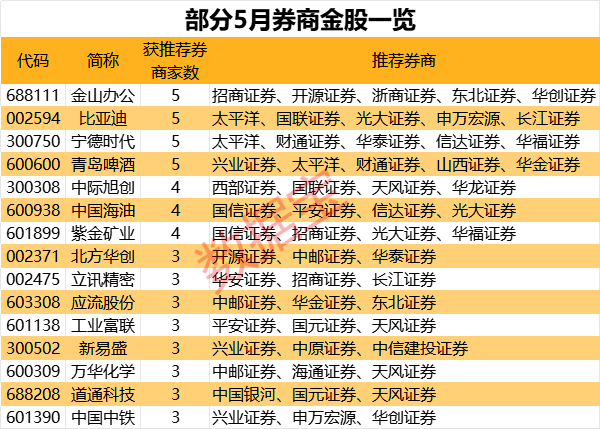 个股来看,获机构推荐次数居前的是金山办公、比亚迪、宁德时代、青岛啤酒,均有5家券商推荐;中际旭创、中国海油、紫金矿业也均获4家券商推荐。