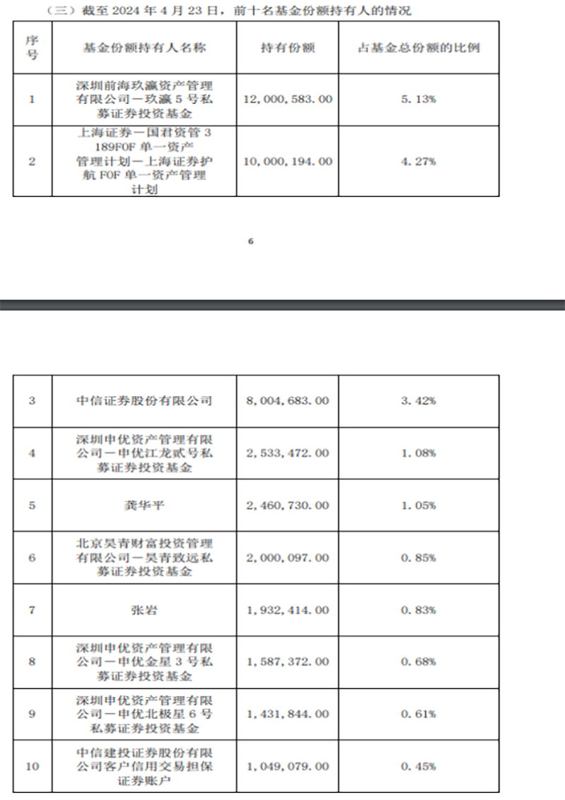 以天弘中证芯片产业ETF为例,截至4月23日,前十名基金份额持有人包括玖瀛5号私募证券投资基金、申优金星3号私募证券投资基金、中信证券等多家机构投资者。