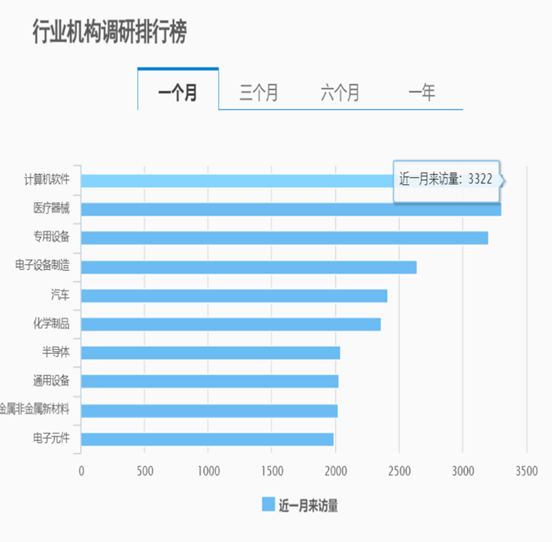 Choice数据显示,近一个月,机构调研次数超过5万次,处于历史较高水平。从具体调研方向看,计算机软件机构调研次数超过3000次,医疗器械专用设备机构调研次数也在3000次以上。