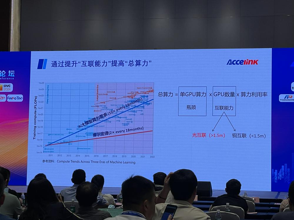 光迅科技数据与接入产业业务部市场总监林韬表示,由于摩尔定律限制,单GPU已遇到增长瓶颈,要提高总算力只能去增加GPU数量,因此需要提升GPU之间的互联能力,目前来看有两种技术,即光互联和铜互联。