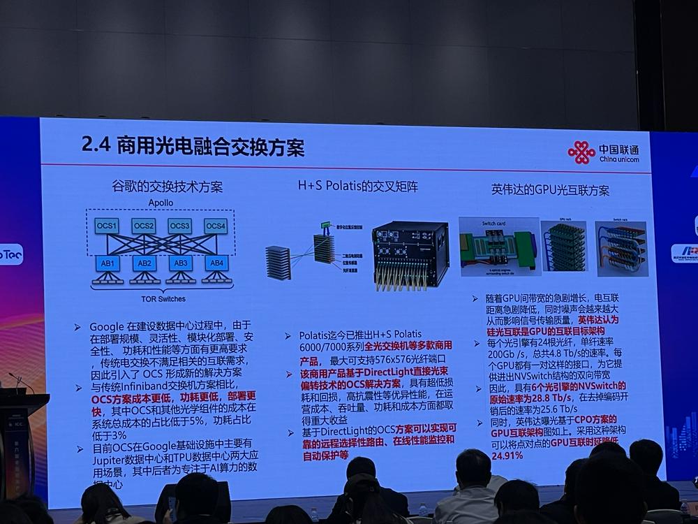 据了解,英伟达亦认为硅光互联是GPU的互联目标架构,其最新基于CPO方案的GPU互联架构降低了近25%时延。中国联通(600050.SH)宽带互联网研究部高速传送与承载技术研究室主任张贺在演讲中提及,谷歌、英伟达等厂商的商用光电融合方案值得借鉴。
