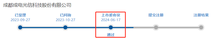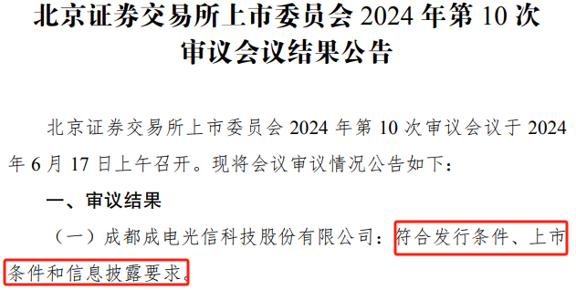根据北交所官网公告,北交所上市委员会2024年第10次审议会议于2024年6月17日上午召开,成都成电光信科技股份有限公司(以下简称成电光信)的审议结果是“符合发行条件、上市条件和信息披露要求”。