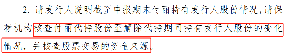 其次,公司被要求说明截至申报期末付丽持有股份情况,保荐机构被要求核查付丽代持股份至解除代持期间持有股份的变化情况,并核查股票交易的资金来源。招股书显示,付丽是公司实控人之一付美的妹妹。