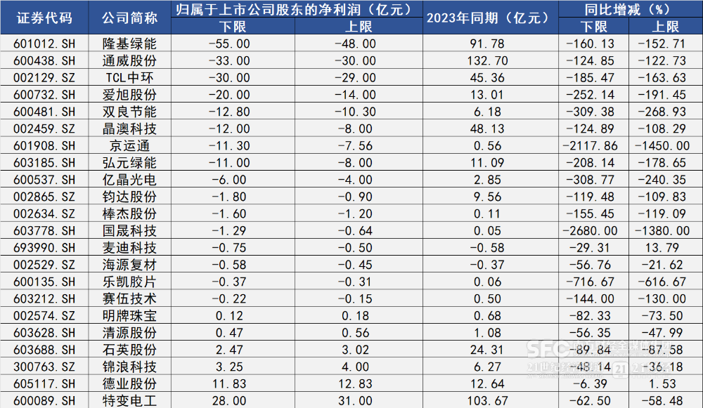 在已披露业绩预告的光伏企业中,隆基绿能、通威股份、TCL中环亏损金额居前。
