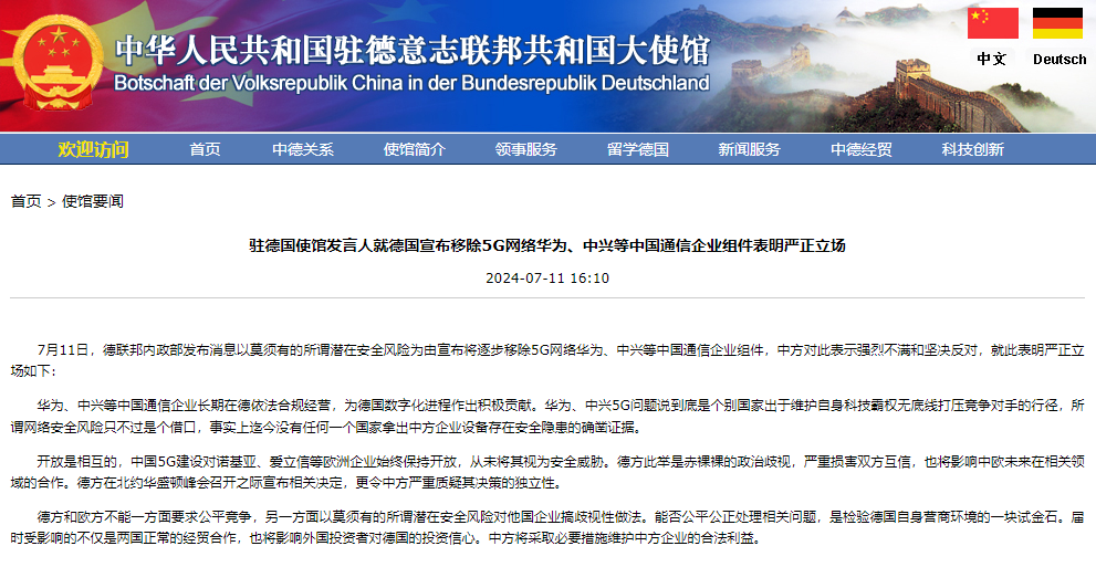 中国驻德国大使馆消息,7月11日,德联邦内政部发布消息以莫须有的所谓潜在安全风险为由宣布将逐步移除5G网络华为、中兴等中国通信企业组件,中方对此表示强烈不满和坚决反对,就此表明严正立场如下: