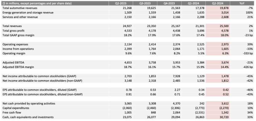 7月24日,特斯拉发布的财报显示,公司第二财季营收255亿美元,同比增长2%,高于分析师预期的245.4亿美元;净利润为14.78亿美元,同比下降45%,低于分析师预期的18.06亿美元;调整后每股收益0.52美元,低于上年同期的0.91美元,亦低于分析师预期的0.6美元;毛利率为18%,高于分析师预期的17.4%。