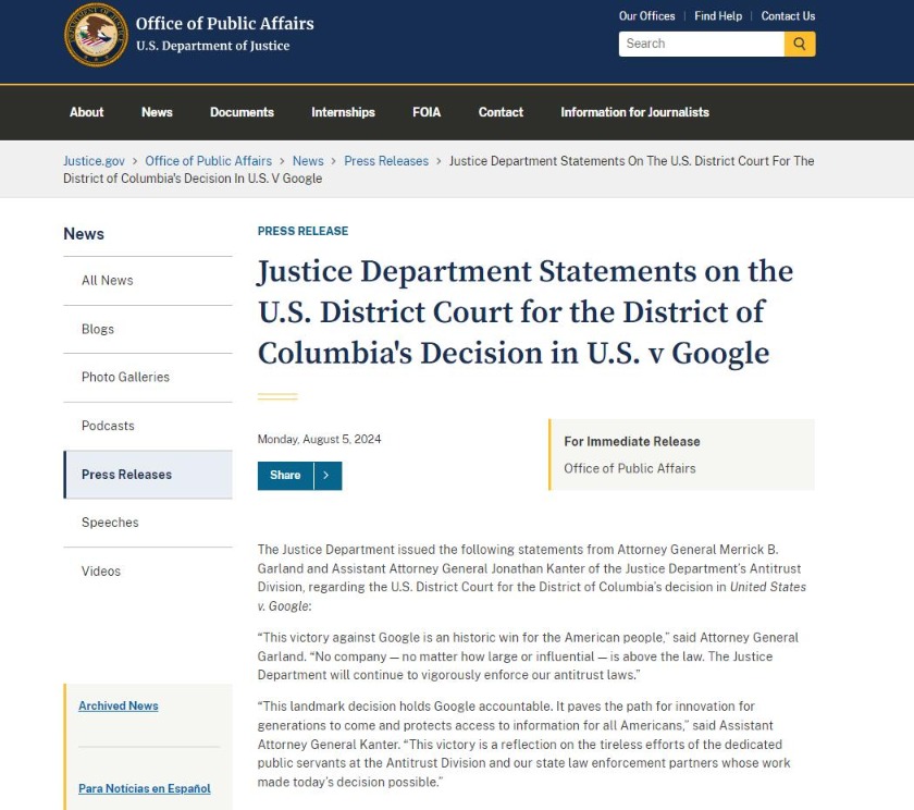 当地时间8月5日,美国司法部就上述裁决发表声明。美国司法部长加兰德在声明中说:“这场对谷歌的胜利是美国人民的历史性胜利,无论多么大或多么有影响力,没有一家公司可以凌驾于法律之上。司法部将继续大力执行我们的反垄断法。”美国助理司法部长坎特表示:“这一具有里程碑意义的决定让谷歌承担责任。它为子孙后代的创新铺平了道路,并保护了所有美国人获取信息的权利。”