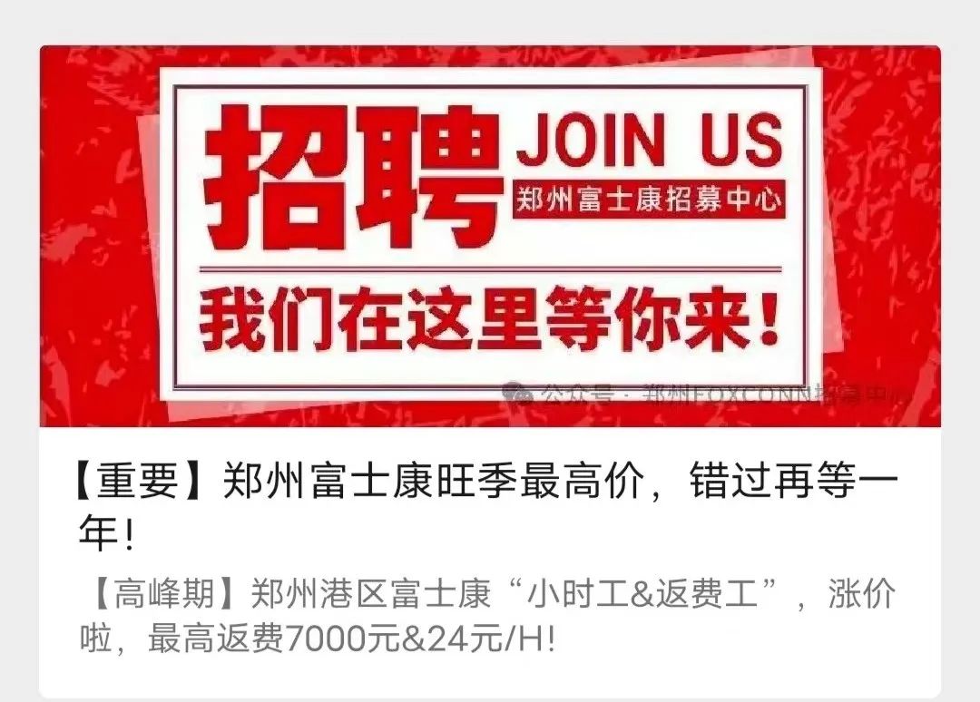 郑州富士康是苹果iPhone的主要生产厂区。根据第三方招聘机构发布的公告,目前郑州富士康仍在招聘,“返费工”在职不少于90天,最高奖励达到7000元。